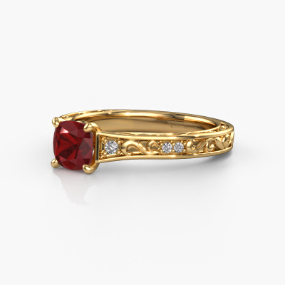 The ring shown above is called the Mallory cus. We call this type of ring a pavé solitaire ring because it has one center gemstone and a band that is also pave set with gemstones. This engagement ring is made in 14 Carat gold set with a 5.5 mm cushion ruby, and pave set diamonds at the sides. Each piece of jewelry is made just for you by our master goldsmiths in our own studio.This Celtic gold pavé solitaire engagement ring has an exquisite cushion ruby center stone. To further accentuate the center stone, the band is set full with more diamonds. Its open prong setting allows light to strike the ruby from various angles and this adds sparkle to your ruby ring. The photo shown above depicts the goldsmith's carefully handcrafted details of the ring. The high positioning of the center stone is truly eye-catching. The perfect engagement ring for the crown jewel of your life!By using our modern techniques, we can design and customize the finest quality jewels with the utmost care for you. Our engagement rings are always priced 30 percent lower than other jewelers. We make engagement rings to order so we don't have to maintain a large stock. If you have a certain budget, we are more than happy to advice you accordingly.Different styles of new rings are made daily by our team. Perhaps you have found a pavé solitaire engagement ring somewhere. One you would like to give to your loved one. Please feel free to share your thoughts and design with our jewel designers. We would love to turn your design into a Celtic engagement ring. You can follow the development of your ring design because we use very detailed 3D drawings. On top of that, you can order a dummy of the design. A dummy is a plastic ring, which can be shaped according your ring design. You can try it on and check if the engagement ring is up to standard. We will gladly send you a non-binding offer, based on a fair price/ quality ratio. The offer will baffle you, considering the quality of the ring and gemstones.To make it easier for you, we offer a 30 day return policy. Check our terms and conditions.
