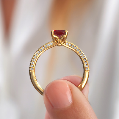 The ring shown above is called the Elenore cus. We call this type of ring a pavé solitaire ring because it has one center gemstone and a band that is also pave set with gemstones. This engagement ring is made in 14 Carat gold set with a 5.5 mm cushion ruby, and pave set lab grown diamonds at the sides. Each piece of jewelry is made by a team of passionate goldsmiths and jewel designers. This will make your crown jewel truly eye-catching.This contemporary gold pavé solitaire engagement ring has an exquisite cushion ruby center stone. To further accentuate the center stone, the band is set full with more lab grown diamonds. Its open prong setting allows light to strike the ruby from various angles and this adds sparkle to your ruby ring. The photo shown above depicts the goldsmith's carefully handcrafted details of the ring. The high positioning of the center stone is truly eye-catching. The perfect engagement ring for the crown jewel of your life!After receiving your order, our goldsmiths will start the creative process of making your Elenore cus engagement ring. We don't keep stock. This is advantageous because these costs will not be passed on to you. Therefore, we can offer jewelry at exceptionally low prices.Have you found a specific engagement ring somewhere which you would like to give to your loved one? Please feel free to express your wishes to our jewel designers because we would be honored to turn your design into a contemporary engagement ring. You can follow the development of your ring design because we use 3D drawings. This gives you a realistic preview of how your design will look. You can also preorder a dummy. A dummy is a plastic ring, which can be shaped according your ring design. You can try it on and check if its width and size are suitable for you. We will gladly send you a non-binding offer, based on a fair price/ quality ratio. It will amaze you, considering the quality of the ring and gemstones.To make it easier for you, we offer a 30 day return policy. Check our terms and conditions.