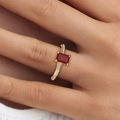 The ring shown above is called the Elenore eme. We call this type of ring a pavé solitaire ring because it has one center gemstone and a band that is also pave set with gemstones. This engagement ring is made in 14 Carat gold set with a 7x5 mm emerald cut ruby, and pave set lab grown diamonds at the sides. Each piece of jewelry is made just for you, with attention to detail and design.This exclusive gold pavé solitaire engagement ring has an exquisite emerald cut ruby center stone. To further accentuate the center stone, the band is set full with more lab grown diamonds. Its open prong setting allows light to strike the ruby from various angles and this adds sparkle to your ruby ring. The photo shown above depicts the goldsmith's carefully handcrafted details of the ring. The high positioning of the center stone is truly eye-catching. The perfect engagement ring for the crown jewel of your life!Are you on a budget? Please feel free to contact us, so we can go discuss your options. We offer our engagement rings at guaranteed best price, because we make them to order. You won't find such a price anywhere else!Have you found a specific engagement ring somewhere which you would like to give to your loved one? Please feel free to express your wishes to our jewel designers because we would be honored to turn your design into a exclusive engagement ring. You can follow the development of your ring design because we use 3D drawings. This gives you a realistic preview of how your design will look. You can also preorder a dummy. A dummy is a plastic ring, which can be shaped according your ring design. You can try it on and check if its width and size are suitable for you. We will gladly send you a non-binding offer, based on a fair price/ quality ratio. It will amaze you, considering the quality of the ring and gemstones.To make it easier for you, we offer a 30 day return policy. Check our terms and conditions.