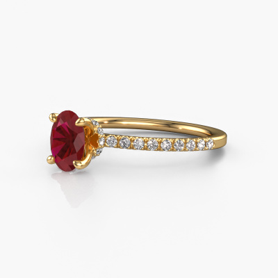 The ring shown above is called the Crystal OVL 4. We call this type of ring a pavé solitaire ring because it has one center gemstone and a band that is also pave set with gemstones. The 14 Carat gold engagement ring is set with a oval 7x5 mm ruby center stone and the band is pave set with diamond gemstones. Each jewel is made with passion and love by one of our master goldsmiths.This contemporary gold pavé solitaire engagement ring has an exquisite oval ruby center stone. To further accentuate the center stone, the band is fully set with more diamonds. Its open prong setting allows light to strike the ruby from various angles and this adds sparkle to your ruby ring. The photo shown above depicts the goldsmith's carefully handcrafted details of the ring. The high positioning of the center stone is truly eye-catching. The perfect engagement ring for the crown jewel of your life! After receiving your order, our goldsmiths will passionately start the creative process of making your engagement ring in our own studio. Because we don't have a big stockpile, these costs will not be passed on to you. Our pricing is proof of that! We offer top quality jewels at lowest price, guaranteed.Our team adds new designs to our online collection daily. Our designers and goldsmiths work together in creating the best design. We strive to offer a diverse collection of jewels. Perhaps you have a specific jewel design in mind. One you came across somewhere. Please contact us for a free consultation. We will make you an offer, based on a fair price/ quality ratio, that will baffle you.To make it easier for you, we offer a 30 day return policy. Check our terms and conditions.