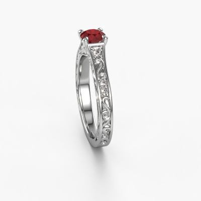 The ring shown above is called the Mallory rnd. We call this type of ring a pavé solitaire ring because it has one center gemstone and a band that is also pave set with gemstones. This engagement ring is made in platinum set with a 5 mm round ruby, and pave set lab grown diamonds at the sides. Each piece of jewelry is made just for you by our master goldsmiths in our own studio.This vintage platinum pavé solitaire engagement ring has an exquisite round ruby center stone. To further accentuate the center stone, the band is set full with more lab grown diamonds. Its open prong setting allows light to strike the ruby from various angles and this adds sparkle to your ruby ring. The photo shown above depicts the goldsmith's carefully handcrafted details of the ring. The high positioning of the center stone is truly eye-catching. The perfect engagement ring for the crown jewel of your life!Because we design and deliver our own rings, we can offer you a engagement ring at a price you won't find anywhere else. A ring is made to order, which helps prevent excess supplies, so we can make you a great price offer. We understand it feels risky, buying your engagement ring online, but we will gladly assist in the designing process, taking your budget into consideration.Different styles of new rings are made daily by our team. Perhaps you have found a pavé solitaire engagement ring somewhere. One you would like to give to your loved one. Please feel free to share your thoughts and design with our jewel designers. We would love to turn your design into a vintage engagement ring. You can follow the development of your ring design because we use very detailed 3D drawings. On top of that, you can order a dummy of the design. A dummy is a plastic ring, which can be shaped according your ring design. You can try it on and check if the engagement ring is up to standard. We will gladly send you a non-binding offer, based on a fair price/ quality ratio. The offer will baffle you, considering the quality of the ring and gemstones.To make it easier for you, we offer a 30 day return policy. Check our terms and conditions.