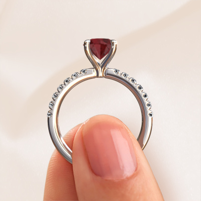 The ring shown above is called the Crystal RND 2. We call this type of ring a pavé solitaire ring because it has one center gemstone and a band that is also pave set with gemstones. The platinum engagement ring is set with a round 7 mm ruby center stone and the band is pave set with lab-grown diamond gemstones. Each jewel is unique in every way! Simply customize to your liking,This classic platinum pavé solitaire engagement ring has an exquisite round ruby center stone. To further accentuate the center stone, the band is fully set with more lab grown diamonds. Its open prong setting allows light to strike the ruby from various angles and this adds sparkle to your ruby ring. The photo shown above depicts the goldsmith's carefully handcrafted details of the ring. The high positioning of the center stone is truly eye-catching. The perfect engagement ring for the crown jewel of your life! After receiving your order, our goldsmiths will start the creative process of making your Crystal RND 2 engagement ring. We don't keep stock. This is advantageous because these costs will not be passed on to you. Therefore, we can offer jewelry at exceptionally low prices.Different styles of new rings are made daily by our team. Perhaps you have found a pavé solitaire engagement ring somewhere. One you would like to give to your loved one. Please feel free to share your thoughts and design with our jewel designers. We would love to turn your design into a classic engagement ring. You can follow the development of your ring design because we use very detailed 3D drawings. On top of that, you can order a dummy of the design. A dummy is a plastic ring, which can be shaped according your ring design. You can try it on and check if the engagement ring is up to standard. We will gladly send you a non-binding offer, based on a fair price/ quality ratio. The offer will baffle you, considering the quality of the ring and gemstones.To make it easier for you, we offer a 30 day return policy. Check our terms and conditions.