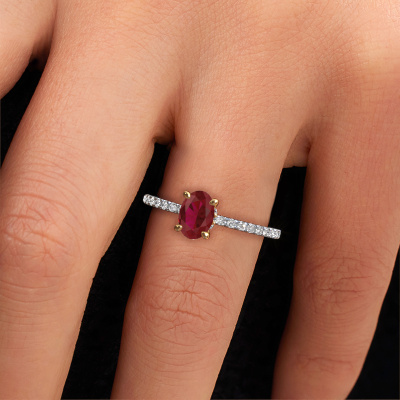 The ring shown above is called the Crystal OVL 4. We call this type of ring a pavé solitaire ring because it has one center gemstone and a band that is also pave set with gemstones. The 14 Carat white gold engagement ring is set with a oval 7x5 mm ruby center stone and the band is pave set with diamond gemstones. Each jewel is made with passion and love by one of our master goldsmiths.This contemporary white gold pavé solitaire engagement ring has an exquisite oval ruby center stone. To further accentuate the center stone, the band is fully set with more diamonds. Its open prong setting allows light to strike the ruby from various angles and this adds sparkle to your ruby ring. The photo shown above depicts the goldsmith's carefully handcrafted details of the ring. The high positioning of the center stone is truly eye-catching. The perfect engagement ring for the crown jewel of your life! After receiving your order, our goldsmiths will passionately start the creative process of making your engagement ring in our own studio. Because we don't have a big stockpile, these costs will not be passed on to you. Our pricing is proof of that! We offer top quality jewels at lowest price, guaranteed.Our team adds new designs to our online collection daily. Our designers and goldsmiths work together in creating the best design. We strive to offer a diverse collection of jewels. Perhaps you have a specific jewel design in mind. One you came across somewhere. Please contact us for a free consultation. We will make you an offer, based on a fair price/ quality ratio, that will baffle you.To make it easier for you, we offer a 30 day return policy. Check our terms and conditions.