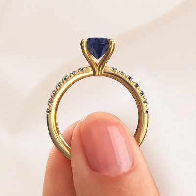 The ring shown above is called the Crystal RND 2. We call this type of ring a pavé solitaire ring because it has one center gemstone and a band that is also pave set with gemstones. The 14 Carat gold engagement ring is set with a round 7.3 mm sapphire center stone and the band is pave set with lab-grown diamond gemstones. Each jewel is unique in every way! Simply customize to your liking,This classic gold pavé solitaire engagement ring has an exquisite round sapphire center stone. To further accentuate the center stone, the band is fully set with more lab grown diamonds. Its open prong setting allows light to strike the sapphire from various angles and this adds sparkle to your sapphire ring. The photo shown above depicts the goldsmith's carefully handcrafted details of the ring. The high positioning of the center stone is truly eye-catching. The perfect engagement ring for the crown jewel of your life! After receiving your order, our goldsmiths will start the creative process of making your Crystal RND 2 engagement ring. We don't keep stock. This is advantageous because these costs will not be passed on to you. Therefore, we can offer jewelry at exceptionally low prices.Different styles of new rings are made daily by our team. Perhaps you have found a pavé solitaire engagement ring somewhere. One you would like to give to your loved one. Please feel free to share your thoughts and design with our jewel designers. We would love to turn your design into a classic engagement ring. You can follow the development of your ring design because we use very detailed 3D drawings. On top of that, you can order a dummy of the design. A dummy is a plastic ring, which can be shaped according your ring design. You can try it on and check if the engagement ring is up to standard. We will gladly send you a non-binding offer, based on a fair price/ quality ratio. The offer will baffle you, considering the quality of the ring and gemstones.To make it easier for you, we offer a 30 day return policy. Check our terms and conditions.