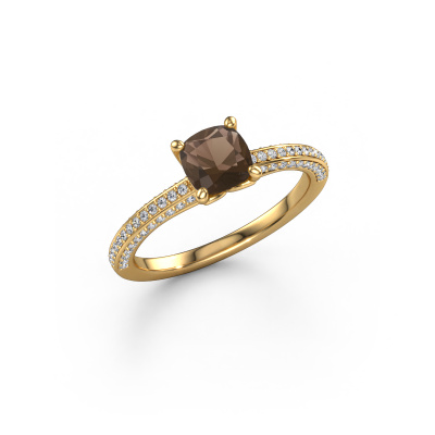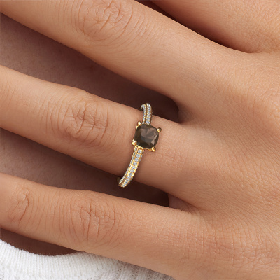 The ring shown above is called the Elenore cus. We call this type of ring a pavé solitaire ring because it has one center gemstone and a band that is also pave set with gemstones. This engagement ring is made in 14 Carat gold set with a 5.5 mm cushion smokey quartz, and pave set lab grown diamonds at the sides. Each piece of jewelry is made by a team of passionate goldsmiths and jewel designers. This will make your crown jewel truly eye-catching.This contemporary gold pavé solitaire engagement ring has an exquisite cushion smokey quartz center stone. To further accentuate the center stone, the band is set full with more lab grown diamonds. Its open prong setting allows light to strike the smokey quartz from various angles and this adds sparkle to your smokey quartz ring. The photo shown above depicts the goldsmith's carefully handcrafted details of the ring. The high positioning of the center stone is truly eye-catching. The perfect engagement ring for the crown jewel of your life!After receiving your order, our goldsmiths will start the creative process of making your Elenore cus engagement ring. We don't keep stock. This is advantageous because these costs will not be passed on to you. Therefore, we can offer jewelry at exceptionally low prices.Have you found a specific engagement ring somewhere which you would like to give to your loved one? Please feel free to express your wishes to our jewel designers because we would be honored to turn your design into a contemporary engagement ring. You can follow the development of your ring design because we use 3D drawings. This gives you a realistic preview of how your design will look. You can also preorder a dummy. A dummy is a plastic ring, which can be shaped according your ring design. You can try it on and check if its width and size are suitable for you. We will gladly send you a non-binding offer, based on a fair price/ quality ratio. It will amaze you, considering the quality of the ring and gemstones.To make it easier for you, we offer a 30 day return policy. Check our terms and conditions.