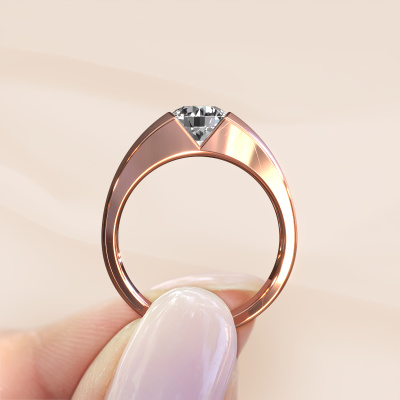 This 14 Carat rose gold ring is called Theresia and is set with 1.00 crt diamond. The tension setting is what makes this a special engagement ring because it emphasizes the diamond. Our expert goldsmith uses special techniques to set the diamond in this rose gold ring. By using these techniques, light reflects freely. This gives the ring its maximum shine and a glamorous appearance. A true work of art! The result is a unique ring, with a trendy appearance, passionately handcrafted to perfection by our expert goldsmith. A one-of-a-kind ring, designed for the love of your life. We recommend a solid gemstone, such as a diamond or sapphire, if you select this ring. The ring must be able to endure a lot of pressure during manufacturing. This piece of jewelry is made just for you by our master goldsmiths in our own studio.By using our modern techniques, we can design and customize the finest quality jewels with the utmost care for you. Our engagement rings are always priced 30 percent lower than other jewelers. We make engagement rings to order so we don't have to maintain a large stock. If you have a certain budget, we are more than happy to advice you accordingly.Different styles of new rings are made daily by our team. Perhaps you have found a solitaire engagement ring somewhere. One you would like to give to your loved one. Please feel free to share your thoughts and design with our jewel designers. We would love to turn your design into a modern engagement ring. You can follow the development of your ring design because we use very detailed 3D drawings. On top of that, you can order a dummy of the design. A dummy is a plastic ring, which can be shaped according your ring design. You can try it on and check if the engagement ring is up to standard. We will gladly send you a non-binding offer, based on a fair price/ quality ratio. The offer will baffle you, considering the quality of the ring and gemstones.To make it easier for you, we offer a 30 day return policy. Check our terms and conditions.