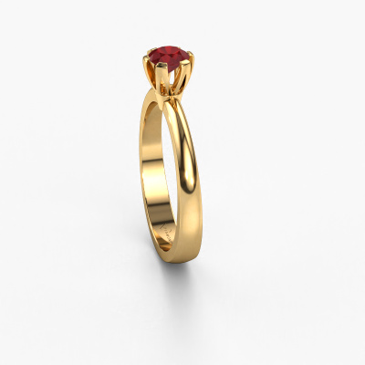 The ring shown above is called the Julia, we call this a solitaire ring because it contains a single gemstone. The engagement ring is made in 14 Carat gold and has a round ruby of 4 mm. This trendy gold solitaire ring with exquisite round ruby is a beautiful engagement ring. The open prong setting allows light to strike the gemstone from various angles. The ring also stands out because of the high positioning of the gemstone. Because diamonds symbolize true love and purity, they make the perfect gift for the love of your life. The symbol of eternal love is the centerpiece of this solitaire ring. Like a diamond, all other types of precious metal have their own attributed symbolic meaning. You can compile the solitaire engagement ring yourself in various precious metal combinations. This one has the combination of 14 Carat gold with gold. Each piece of jewelry is created to add sparkle to your finger, each jewel is lovingly made by hand by our goldsmiths.Are you on a budget? Please feel free to contact us, so we can go discuss your options. We offer our engagement rings at guaranteed best price, because we make them to order. You won't find such a price anywhere else!Different styles of new rings are made daily by our team. Perhaps you have found a solitaire engagement ring somewhere. One you would like to give to your loved one. Please feel free to share your thoughts and design with our jewel designers. We would love to turn your design into a trendy engagement ring. You can follow the development of your ring design because we use very detailed 3D drawings. On top of that, you can order a dummy of the design. A dummy is a plastic ring, which can be shaped according your ring design. You can try it on and check if the engagement ring is up to standard. We will gladly send you a non-binding offer, based on a fair price/ quality ratio. The offer will baffle you, considering the quality of the ring and gemstones.To make it easier for you, we offer a 30 day return policy. Check our terms and conditions.