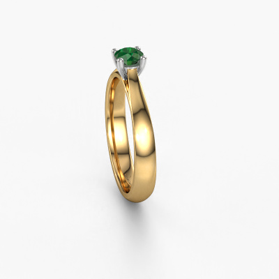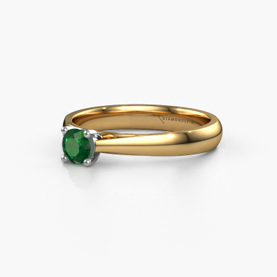 The ring shown above is called the Sam, we call this a solitaire ring because it contains a single gemstone. The engagement ring is made in 14 Carat gold and has a round emerald of 4.2 mm. This classic gold solitaire ring with exquisite round emerald is a beautiful engagement ring. The open prong setting allows light to strike the gemstone from various angles. The ring also stands out because of the high positioning of the gemstone. Because diamonds symbolize true love and purity, they make the perfect gift for the love of your life. The symbol of eternal love is the centerpiece of this solitaire ring. Like a diamond, all other types of precious metal have their own attributed symbolic meaning. You can compile the solitaire engagement ring yourself in various precious metal combinations. This one has the combination of 14 Carat gold with white gold. Each piece of jewelry is made just for you, with attention to detail and design.After receiving your order, our goldsmiths will passionately start the creative process of making your engagement ring in our own studio. Because we don't have a big stockpile, these costs will not be passed on to you. Our pricing is proof of that! We offer top quality jewels at lowest price, guaranteed.Our team adds new designs to our online collection daily. Our designers and goldsmiths work together in creating the best design. We strive to offer a diverse collection of jewels. Perhaps you have a specific jewel design in mind. One you came across somewhere. Please contact us for a free consultation. We will make you an offer, based on a fair price/ quality ratio, that will baffle you.To make it easier for you, we offer a 30 day return policy. Check our terms and conditions.