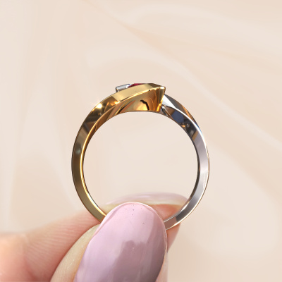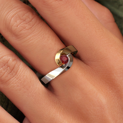 The ring shown above is called the Sheryl, we call this a solitaire ring because it contains a single gemstone. The engagement ring is made in 14 Carat gold and has a round ruby of 3.7 mm. This contemporary gold solitaire ring with exquisite round ruby is a beautiful engagement ring. The open prong setting allows light to strike the gemstone from various angles. The ring also stands out because of the high positioning of the gemstone. Because diamonds symbolize true love and purity, they make the perfect gift for the love of your life. The symbol of eternal love is the centerpiece of this solitaire ring. Like a diamond, all other types of precious metal have their own attributed symbolic meaning. You can compile the solitaire engagement ring yourself in various precious metal combinations. This one has the combination of 14 Carat gold with white gold. Each piece of jewelry is unique in every way! Simply customize to your likingBy using our modern techniques, we can design and customize the finest quality jewels with the utmost care for you. Our engagement rings are always priced 30 percent lower than other jewelers. We make engagement rings to order so we don't have to maintain a large stock. If you have a certain budget, we are more than happy to advice you accordingly.Our team adds new designs to our online collection daily. Our designers and goldsmiths work together in creating the best design. We strive to offer a diverse collection of jewels. Perhaps you have a specific jewel design in mind. One you came across somewhere. Please contact us for a free consultation. We will make you an offer, based on a fair price/ quality ratio, that will baffle you.To make it easier for you, we offer a 30 day return policy. Check our terms and conditions.
