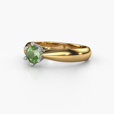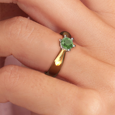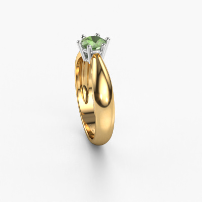 The ring shown above is called the Fay, we call this a solitaire ring because it contains a single gemstone. The engagement ring is made in 14 Carat gold and has a round tourmaline green of 5 mm. This traditional gold solitaire ring with exquisite round tourmaline green is a beautiful engagement ring. The open prong setting allows light to strike the gemstone from various angles. The ring also stands out because of the high positioning of the gemstone. Because diamonds symbolize true love and purity, they make the perfect gift for the love of your life. The symbol of eternal love is the centerpiece of this solitaire ring. Like a diamond, all other types of precious metal have their own attributed symbolic meaning. You can compile the solitaire engagement ring yourself in various precious metal combinations. This one has the combination of 14 Carat gold with white gold. Each piece of jewelry is made just for you by our master goldsmiths in our own studio.By using a combination of the latest modern techniques, combined with ancient crafting, we can make all our engagement rings in our own studio. Each jewel is made to order. This is advantageous because we can offer you a price you won't find anywhere else.Have you found a specific engagement ring somewhere which you would like to give to your loved one? Please feel free to express your wishes to our jewel designers because we would be honored to turn your design into a traditional engagement ring. You can follow the development of your ring design because we use 3D drawings. This gives you a realistic preview of how your design will look. You can also preorder a dummy. A dummy is a plastic ring, which can be shaped according your ring design. You can try it on and check if its width and size are suitable for you. We will gladly send you a non-binding offer, based on a fair price/ quality ratio. It will amaze you, considering the quality of the ring and gemstones.To make it easier for you, we offer a 30 day return policy. Check our terms and conditions.