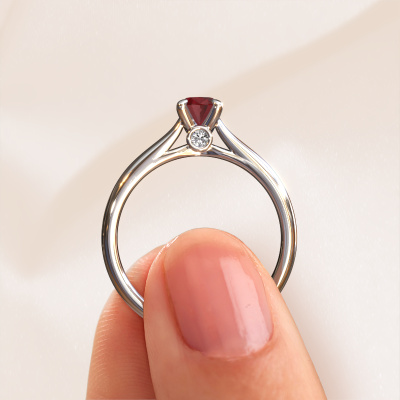 The ring shown above is called the Valorie ovl 1, we call this a solitaire ring because it contains a single gemstone. The engagement ring is made in platinum and has a oval ruby of 6.5x4.5 mm. This modern platinum solitaire ring with exquisite oval ruby is a beautiful engagement ring. The open prong setting allows light to strike the gemstone from various angles. The ring also stands out because of the high positioning of the gemstone. Because diamonds symbolize true love and purity, they make the perfect gift for the love of your life. The symbol of eternal love is the centerpiece of this solitaire ring. Like a diamond, all other types of precious metal have their own attributed symbolic meaning. You can compile the solitaire engagement ring yourself in various precious metal combinations. This one has the combination of platinum with platinum. Each piece of jewelry is made just for you, with attention to detail and design.By using our modern techniques, we can design and customize the finest quality jewels with the utmost care for you. Our engagement rings are always priced 30 percent lower than other jewelers. We make engagement rings to order so we don't have to maintain a large stock. If you have a certain budget, we are more than happy to advice you accordingly.Do you have a specific ring in mind? One you came across somewhere. Please feel free to tell us your wishes and we will turn your design into a unique engagement ring. You can follow the development of your ring design because we use 3D drawings. This gives you a realistic preview of your design. We will gladly send you a non-binding offer, based on a fair price/ quality ratio. It will amaze you.To make it easier for you, we offer a 30 day return policy. Check our terms and conditions.
