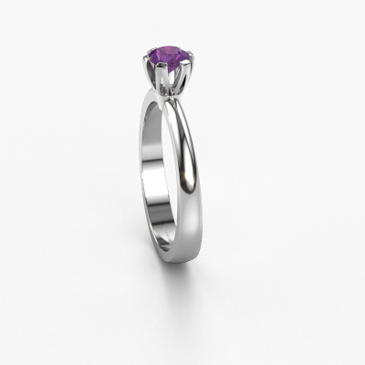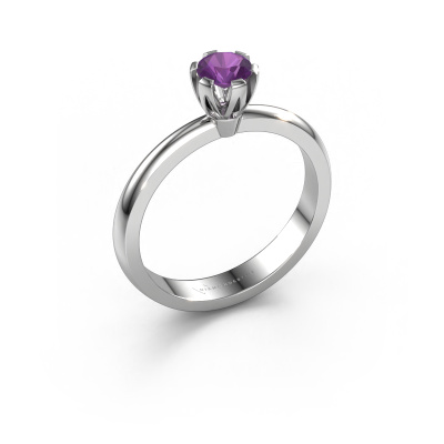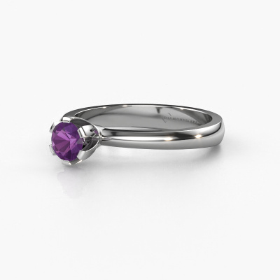 The ring shown above is called the Julia, we call this a solitaire ring because it contains a single gemstone. The engagement ring is made in platinum and has a round amethyst of 4 mm. This trendy platinum solitaire ring with exquisite round amethyst is a beautiful engagement ring. The open prong setting allows light to strike the gemstone from various angles. The ring also stands out because of the high positioning of the gemstone. Because diamonds symbolize true love and purity, they make the perfect gift for the love of your life. The symbol of eternal love is the centerpiece of this solitaire ring. Like a diamond, all other types of precious metal have their own attributed symbolic meaning. You can compile the solitaire engagement ring yourself in various precious metal combinations. This one has the combination of platinum with platinum. Each piece of jewelry is created to add sparkle to your finger, each jewel is lovingly made by hand by our goldsmiths.Are you on a budget? Please feel free to contact us, so we can go discuss your options. We offer our engagement rings at guaranteed best price, because we make them to order. You won't find such a price anywhere else!Different styles of new rings are made daily by our team. Perhaps you have found a solitaire engagement ring somewhere. One you would like to give to your loved one. Please feel free to share your thoughts and design with our jewel designers. We would love to turn your design into a trendy engagement ring. You can follow the development of your ring design because we use very detailed 3D drawings. On top of that, you can order a dummy of the design. A dummy is a plastic ring, which can be shaped according your ring design. You can try it on and check if the engagement ring is up to standard. We will gladly send you a non-binding offer, based on a fair price/ quality ratio. The offer will baffle you, considering the quality of the ring and gemstones.To make it easier for you, we offer a 30 day return policy. Check our terms and conditions.