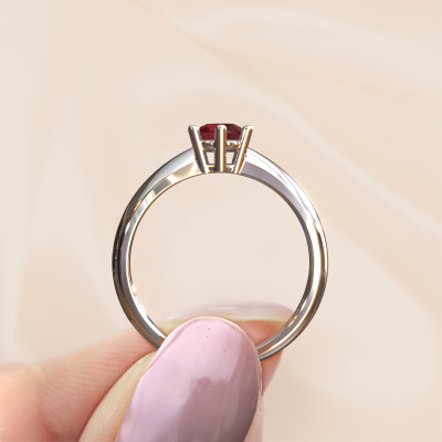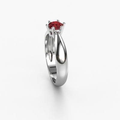 The ring shown above is called the Fay, we call this a solitaire ring because it contains a single gemstone. The engagement ring is made in platinum and has a round ruby of 5 mm. This traditional platinum solitaire ring with exquisite round ruby is a beautiful engagement ring. The open prong setting allows light to strike the gemstone from various angles. The ring also stands out because of the high positioning of the gemstone. Because diamonds symbolize true love and purity, they make the perfect gift for the love of your life. The symbol of eternal love is the centerpiece of this solitaire ring. Like a diamond, all other types of precious metal have their own attributed symbolic meaning. You can compile the solitaire engagement ring yourself in various precious metal combinations. This one has the combination of platinum with platinum. Each piece of jewelry is made just for you by our master goldsmiths in our own studio.By using a combination of the latest modern techniques, combined with ancient crafting, we can make all our engagement rings in our own studio. Each jewel is made to order. This is advantageous because we can offer you a price you won't find anywhere else.Have you found a specific engagement ring somewhere which you would like to give to your loved one? Please feel free to express your wishes to our jewel designers because we would be honored to turn your design into a traditional engagement ring. You can follow the development of your ring design because we use 3D drawings. This gives you a realistic preview of how your design will look. You can also preorder a dummy. A dummy is a plastic ring, which can be shaped according your ring design. You can try it on and check if its width and size are suitable for you. We will gladly send you a non-binding offer, based on a fair price/ quality ratio. It will amaze you, considering the quality of the ring and gemstones.To make it easier for you, we offer a 30 day return policy. Check our terms and conditions.