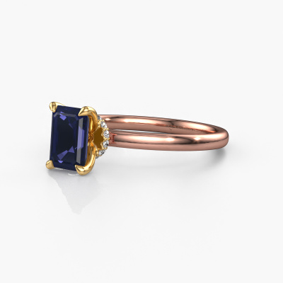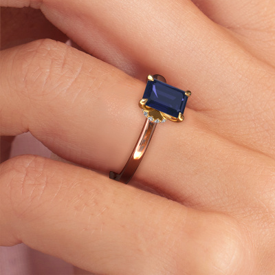 The ring shown above is called the Crystal EME 3, we call this a solitaire ring because it contains a single gemstone. The engagement ring is made in 14 Carat rose gold and has a emerald cut sapphire of 7x5 mm. This classic rose gold solitaire ring with exquisite emerald cut sapphire is a beautiful engagement ring. The open prong setting allows light to strike the gemstone from various angles. The ring also stands out because of the high positioning of the gemstone. Because diamonds symbolize true love and purity, they make the perfect gift for the love of your life. The symbol of eternal love is the centerpiece of this solitaire ring. Like a diamond, all other types of precious metal have their own attributed symbolic meaning. You can compile the solitaire engagement ring yourself in various precious metal combinations. This one has the combination of 14 Carat rose gold with gold. Each piece of jewelry is made by a team of passionate goldsmiths and jewel designers. This will make your crown jewel truly eye-catching.By using our modern techniques, we can design and customize the finest quality jewels with the utmost care for you. Our engagement rings are always priced 30 percent lower than other jewelers. We make engagement rings to order so we don't have to maintain a large stock. If you have a certain budget, we are more than happy to advice you accordingly.Do you have a specific ring in mind? One you came across somewhere. Please feel free to tell us your wishes and we will turn your design into a unique engagement ring. You can follow the development of your ring design because we use 3D drawings. This gives you a realistic preview of your design. We will gladly send you a non-binding offer, based on a fair price/ quality ratio. It will amaze you.To make it easier for you, we offer a 30 day return policy. Check our terms and conditions.