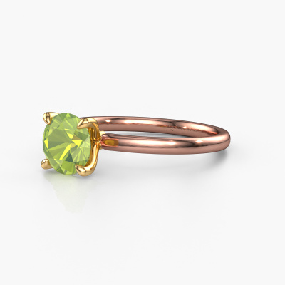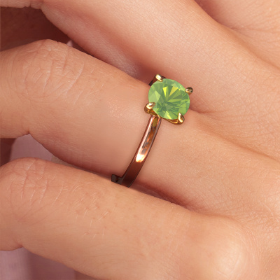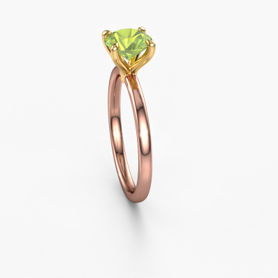 The ring shown above is called the Crystal RND 1, we call this a solitaire ring because it contains a single gemstone. The engagement ring is made in 14 Carat rose gold and has a round peridot of 6.8 mm. This classic rose gold solitaire ring with exquisite round peridot is a beautiful engagement ring. The open prong setting allows light to strike the gemstone from various angles. The ring also stands out because of the high positioning of the gemstone. Because diamonds symbolize true love and purity, they make the perfect gift for the love of your life. The symbol of eternal love is the centerpiece of this solitaire ring. Like a diamond, all other types of precious metal have their own attributed symbolic meaning. You can compile the solitaire engagement ring yourself in various precious metal combinations. This one has the combination of 14 Carat rose gold with gold. Each piece of jewelry is made by a team of passionate goldsmiths and jewel designers. This will make your crown jewel truly eye-catching.After receiving your order, our goldsmiths will passionately start the creative process of making your engagement ring in our own studio. Because we don't have a big stockpile, these costs will not be passed on to you. Our pricing is proof of that! We offer top quality jewels at lowest price, guaranteed.Do you have a specific ring in mind? One you came across somewhere. Please feel free to tell us your wishes and we will turn your design into a unique engagement ring. You can follow the development of your ring design because we use 3D drawings. This gives you a realistic preview of your design. We will gladly send you a non-binding offer, based on a fair price/ quality ratio. It will amaze you.To make it easier for you, we offer a 30 day return policy. Check our terms and conditions.