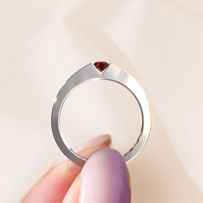 This 14 Carat white gold ring is called Lizzy 1 and is set with garnet. Do you keep up with the latest fashion trends? Do you want a unique engagement ring that matches your lifestyle? This edgy engagement ring is an extraordinary ring which can be custom made to fit your or her personal style. This modern white gold engagement ring is set with garnet. Our garnet are carefully selected for this specific ring in order to create the best effect. Our expert goldsmith will create your ring in our own artisan studio where the garnet will be set with great care. The ring will then be polished to perfection. Nothing but the best for the love of your life! This jewel is created to add sparkle to your finger, each jewel is lovingly made by hand by our goldsmiths.By using our modern techniques, we can design and customize the finest quality jewels with the utmost care for you. Our engagement rings are always priced 30 percent lower than other jewelers. We make engagement rings to order so we don't have to maintain a large stock. If you have a certain budget, we are more than happy to advice you accordingly.Do you have a specific ring in mind? One you came across somewhere. Please feel free to tell us your wishes and we will turn your design into a unique engagement ring. You can follow the development of your ring design because we use 3D drawings. This gives you a realistic preview of your design. We will gladly send you a non-binding offer, based on a fair price/ quality ratio. It will amaze you.To make it easier for you, we offer a 30 day return policy. Check our terms and conditions.