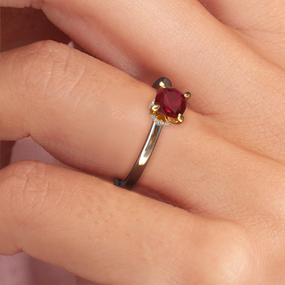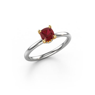 The ring shown above is called the Crystal CUS 3, we call this a solitaire ring because it contains a single gemstone. The engagement ring is made in 14 Carat white gold and has a cushion ruby of 5 mm. This fashionable white gold solitaire ring with exquisite cushion ruby is a beautiful engagement ring. The open prong setting allows light to strike the gemstone from various angles. The ring also stands out because of the high positioning of the gemstone. Because diamonds symbolize true love and purity, they make the perfect gift for the love of your life. The symbol of eternal love is the centerpiece of this solitaire ring. Like a diamond, all other types of precious metal have their own attributed symbolic meaning. You can compile the solitaire engagement ring yourself in various precious metal combinations. This one has the combination of 14 Carat white gold with gold. Each piece of jewelry is made by a team of passionate goldsmiths and jewel designers. This will make your crown jewel truly eye-catching.By using a combination of the latest modern techniques, combined with ancient crafting, we can make all our engagement rings in our own studio. Each jewel is made to order. This is advantageous because we can offer you a price you won't find anywhere else.Our designers and goldsmiths work together each day, creating new jewels. Perhaps you have found a nice fashionable engagement ring somewhere, which can be used to customize your unique ring. Please feel free to contact us. We will make you an offer, based on a fair price/ quality ratio, which will amaze you.To make it easier for you, we offer a 30 day return policy. Check our terms and conditions.