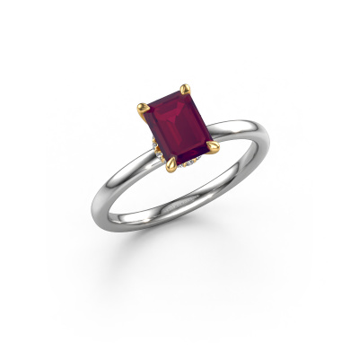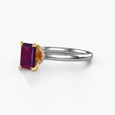 The ring shown above is called the Crystal EME 3, we call this a solitaire ring because it contains a single gemstone. The engagement ring is made in 14 Carat white gold and has a emerald cut rhodolite of 7x5 mm. This classic white gold solitaire ring with exquisite emerald cut rhodolite is a beautiful engagement ring. The open prong setting allows light to strike the gemstone from various angles. The ring also stands out because of the high positioning of the gemstone. Because diamonds symbolize true love and purity, they make the perfect gift for the love of your life. The symbol of eternal love is the centerpiece of this solitaire ring. Like a diamond, all other types of precious metal have their own attributed symbolic meaning. You can compile the solitaire engagement ring yourself in various precious metal combinations. This one has the combination of 14 Carat white gold with gold. Each piece of jewelry is made by a team of passionate goldsmiths and jewel designers. This will make your crown jewel truly eye-catching.By using our modern techniques, we can design and customize the finest quality jewels with the utmost care for you. Our engagement rings are always priced 30 percent lower than other jewelers. We make engagement rings to order so we don't have to maintain a large stock. If you have a certain budget, we are more than happy to advice you accordingly.Do you have a specific ring in mind? One you came across somewhere. Please feel free to tell us your wishes and we will turn your design into a unique engagement ring. You can follow the development of your ring design because we use 3D drawings. This gives you a realistic preview of your design. We will gladly send you a non-binding offer, based on a fair price/ quality ratio. It will amaze you.To make it easier for you, we offer a 30 day return policy. Check our terms and conditions.