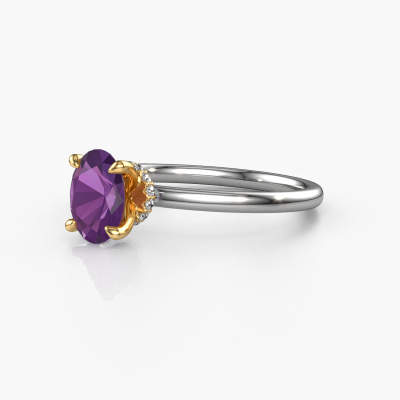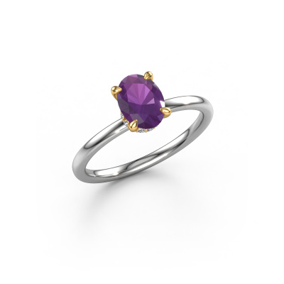 The ring shown above is called the Crystal OVL 3, we call this a solitaire ring because it contains a single gemstone. The engagement ring is made in 14 Carat white gold and has a oval amethyst of 7,5x5,5 mm. This unique white gold solitaire ring with exquisite oval amethyst is a beautiful engagement ring. The open prong setting allows light to strike the gemstone from various angles. The ring also stands out because of the high positioning of the gemstone. Because diamonds symbolize true love and purity, they make the perfect gift for the love of your life. The symbol of eternal love is the centerpiece of this solitaire ring. Like a diamond, all other types of precious metal have their own attributed symbolic meaning. You can compile the solitaire engagement ring yourself in various precious metal combinations. This one has the combination of 14 Carat white gold with gold. Each piece of jewelry is made just for you by our master goldsmiths in our own studio.After receiving your order, our goldsmiths will passionately start the creative process of making your engagement ring in our own studio. Because we don't have a big stockpile, these costs will not be passed on to you. Our pricing is proof of that! We offer top quality jewels at lowest price, guaranteed.Our designers and goldsmiths work together each day, creating new jewels. Perhaps you have found a nice unique engagement ring somewhere, which can be used to customize your unique ring. Please feel free to contact us. We will make you an offer, based on a fair price/ quality ratio, which will amaze you.To make it easier for you, we offer a 30 day return policy. Check our terms and conditions.