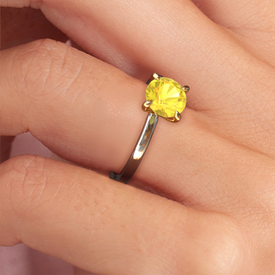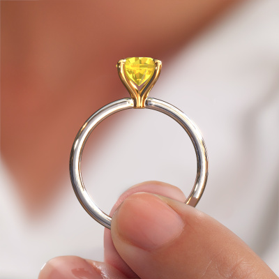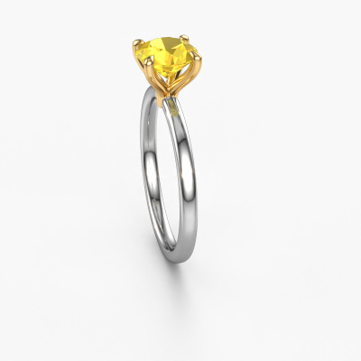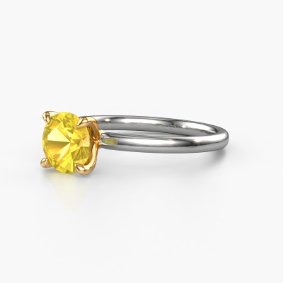 The ring shown above is called the Crystal RND 1, we call this a solitaire ring because it contains a single gemstone. The engagement ring is made in 14 Carat white gold and has a round yellow sapphire of 6.8 mm. This classic white gold solitaire ring with exquisite round yellow sapphire is a beautiful engagement ring. The open prong setting allows light to strike the gemstone from various angles. The ring also stands out because of the high positioning of the gemstone. Because diamonds symbolize true love and purity, they make the perfect gift for the love of your life. The symbol of eternal love is the centerpiece of this solitaire ring. Like a diamond, all other types of precious metal have their own attributed symbolic meaning. You can compile the solitaire engagement ring yourself in various precious metal combinations. This one has the combination of 14 Carat white gold with gold. Each piece of jewelry is made by a team of passionate goldsmiths and jewel designers. This will make your crown jewel truly eye-catching.After receiving your order, our goldsmiths will passionately start the creative process of making your engagement ring in our own studio. Because we don't have a big stockpile, these costs will not be passed on to you. Our pricing is proof of that! We offer top quality jewels at lowest price, guaranteed.Do you have a specific ring in mind? One you came across somewhere. Please feel free to tell us your wishes and we will turn your design into a unique engagement ring. You can follow the development of your ring design because we use 3D drawings. This gives you a realistic preview of your design. We will gladly send you a non-binding offer, based on a fair price/ quality ratio. It will amaze you.To make it easier for you, we offer a 30 day return policy. Check our terms and conditions.