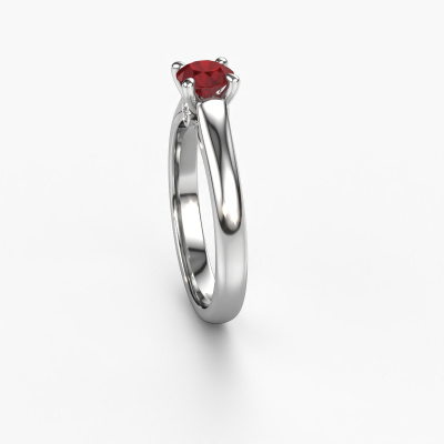 The ring shown above is called the Valorie RND 1, we call this a solitaire ring because it contains a single gemstone. The engagement ring is made in 14 Carat white gold and has a round ruby of 5 mm. This modern white gold solitaire ring with exquisite round ruby is a beautiful engagement ring. The open prong setting allows light to strike the gemstone from various angles. The ring also stands out because of the high positioning of the gemstone. Because diamonds symbolize true love and purity, they make the perfect gift for the love of your life. The symbol of eternal love is the centerpiece of this solitaire ring. Like a diamond, all other types of precious metal have their own attributed symbolic meaning. You can compile the solitaire engagement ring yourself in various precious metal combinations. This one has the combination of 14 Carat white gold with white gold. Each piece of jewelry is made just for you, with attention to detail and design.By using our modern techniques, we can design and customize the finest quality jewels with the utmost care for you. Our engagement rings are always priced 30 percent lower than other jewelers. We make engagement rings to order so we don't have to maintain a large stock. If you have a certain budget, we are more than happy to advice you accordingly.Do you have a specific ring in mind? One you came across somewhere. Please feel free to tell us your wishes and we will turn your design into a unique engagement ring. You can follow the development of your ring design because we use 3D drawings. This gives you a realistic preview of your design. We will gladly send you a non-binding offer, based on a fair price/ quality ratio. It will amaze you.To make it easier for you, we offer a 30 day return policy. Check our terms and conditions.