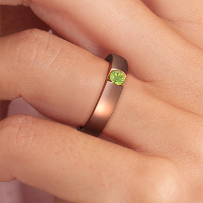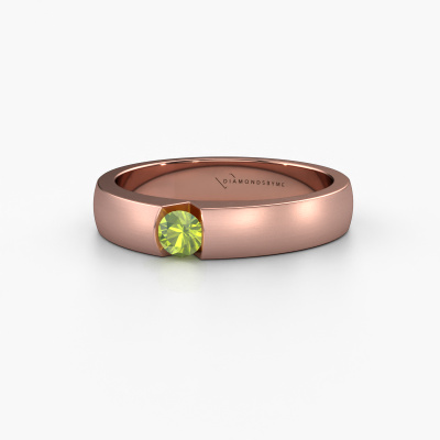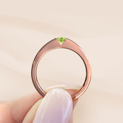 This 14 Carat rose gold ring is called Theresia and is set with 3.4 mm peridot. The tension setting is what makes this a special engagement ring because it emphasizes the peridot. Our expert goldsmith uses special techniques to set the peridot in this rose gold ring. By using these techniques, light reflects freely. This gives the ring its maximum shine and a glamorous appearance. A true work of art! The result is a unique ring, with a trendy appearance, passionately handcrafted to perfection by our expert goldsmith. A one-of-a-kind ring, designed for the love of your life. We recommend a solid gemstone, such as a diamond or sapphire, if you select this ring. The ring must be able to endure a lot of pressure during manufacturing. This piece of jewelry is made just for you by our master goldsmiths in our own studio.By using our modern techniques, we can design and customize the finest quality jewels with the utmost care for you. Our engagement rings are always priced 30 percent lower than other jewelers. We make engagement rings to order so we don't have to maintain a large stock. If you have a certain budget, we are more than happy to advice you accordingly.Different styles of new rings are made daily by our team. Perhaps you have found a solitaire engagement ring somewhere. One you would like to give to your loved one. Please feel free to share your thoughts and design with our jewel designers. We would love to turn your design into a modern engagement ring. You can follow the development of your ring design because we use very detailed 3D drawings. On top of that, you can order a dummy of the design. A dummy is a plastic ring, which can be shaped according your ring design. You can try it on and check if the engagement ring is up to standard. We will gladly send you a non-binding offer, based on a fair price/ quality ratio. The offer will baffle you, considering the quality of the ring and gemstones.To make it easier for you, we offer a 30 day return policy. Check our terms and conditions.