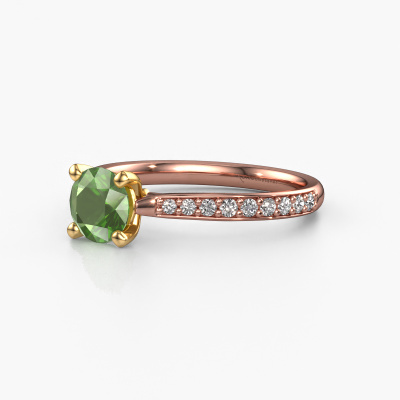 The ring shown above is called the Mignon rnd 2. We call this type of ring a pavé solitaire ring because it has one center gemstone and a band that is also pave set with gemstones. The 14 Carat rose gold engagement ring is set with a round 6 mm tourmaline green center stone and the band is pave set with lab-grown diamond gemstones. Each jewel is made by a team of passionate goldsmiths and jewel designers. This will make your crown jewel truly eye-catching.This luxury rose gold pavé solitaire engagement ring has an exquisite round tourmaline green center stone. To further accentuate the center stone, the band is fully set with more lab grown diamonds. Its open prong setting allows light to strike the tourmaline green from various angles and this adds sparkle to your tourmaline green ring. The photo shown above depicts the goldsmith's carefully handcrafted details of the ring. The high positioning of the center stone is truly eye-catching. The perfect engagement ring for the crown jewel of your life! By using our modern techniques, we can design and customize the finest quality jewels with the utmost care for you. Our engagement rings are always priced 30 percent lower than other jewelers. We make engagement rings to order so we don't have to maintain a large stock. If you have a certain budget, we are more than happy to advice you accordingly.Different styles of new rings are made daily by our team. Perhaps you have found a pavé solitaire engagement ring somewhere. One you would like to give to your loved one. Please feel free to share your thoughts and design with our jewel designers. We would love to turn your design into a luxury engagement ring. You can follow the development of your ring design because we use very detailed 3D drawings. On top of that, you can order a dummy of the design. A dummy is a plastic ring, which can be shaped according your ring design. You can try it on and check if the engagement ring is up to standard. We will gladly send you a non-binding offer, based on a fair price/ quality ratio. The offer will baffle you, considering the quality of the ring and gemstones.To make it easier for you, we offer a 30 day return policy. Check our terms and conditions.