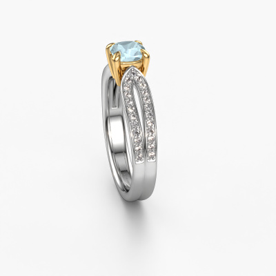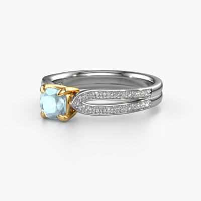 The ring shown above is called the Antonia cus 2. We call this type of ring a pavé solitaire ring because it has one center gemstone and a band that is also pave set with gemstones. The 14 Carat white gold engagement ring is set with a cushion 5 mm aquamarine center stone and the band is pave set with lab-grown diamond gemstones. Each jewel is made just for you by our master goldsmiths in our own studio.This fantasy white gold pavé solitaire engagement ring has an exquisite cushion aquamarine center stone. To further accentuate the center stone, the band is fully set with more lab grown diamonds. Its open prong setting allows light to strike the aquamarine from various angles and this adds sparkle to your aquamarine ring. The photo shown above depicts the goldsmith's carefully handcrafted details of the ring. The high positioning of the center stone is truly eye-catching. The perfect engagement ring for the crown jewel of your life! By using our modern techniques, we can design and customize the finest quality jewels with the utmost care for you. Our engagement rings are always priced 30 percent lower than other jewelers. We make engagement rings to order so we don't have to maintain a large stock. If you have a certain budget, we are more than happy to advice you accordingly.Have you found a specific engagement ring somewhere which you would like to give to your loved one? Please feel free to express your wishes to our jewel designers because we would be honored to turn your design into a fantasy engagement ring. You can follow the development of your ring design because we use 3D drawings. This gives you a realistic preview of how your design will look. You can also preorder a dummy. A dummy is a plastic ring, which can be shaped according your ring design. You can try it on and check if its width and size are suitable for you. We will gladly send you a non-binding offer, based on a fair price/ quality ratio. It will amaze you, considering the quality of the ring and gemstones.To make it easier for you, we offer a 30 day return policy. Check our terms and conditions.