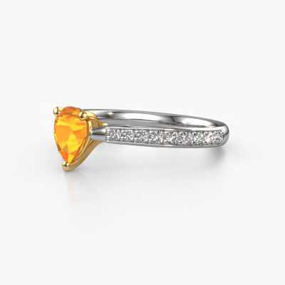 The ring shown above is called the Mignon per 2. We call this type of ring a pavé solitaire ring because it has one center gemstone and a band that is also pave set with gemstones. The 14 Carat white gold engagement ring is set with a pear 6.5x4.5 mm citrin center stone and the band is pave set with diamond gemstones. Each jewel is made just for you by our master goldsmiths in our own studio.This trendy white gold pavé solitaire engagement ring has an exquisite pear citrin center stone. To further accentuate the center stone, the band is fully set with more diamonds. Its open prong setting allows light to strike the citrin from various angles and this adds sparkle to your citrin ring. The photo shown above depicts the goldsmith's carefully handcrafted details of the ring. The high positioning of the center stone is truly eye-catching. The perfect engagement ring for the crown jewel of your life! Are you on a budget? Please feel free to contact us, so we can go discuss your options. We offer our engagement rings at guaranteed best price, because we make them to order. You won't find such a price anywhere else!Our team adds new designs to our online collection daily. Our designers and goldsmiths work together in creating the best design. We strive to offer a diverse collection of jewels. Perhaps you have a specific jewel design in mind. One you came across somewhere. Please contact us for a free consultation. We will make you an offer, based on a fair price/ quality ratio, that will baffle you.To make it easier for you, we offer a 30 day return policy. Check our terms and conditions.