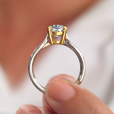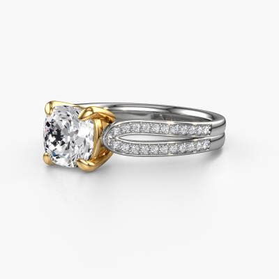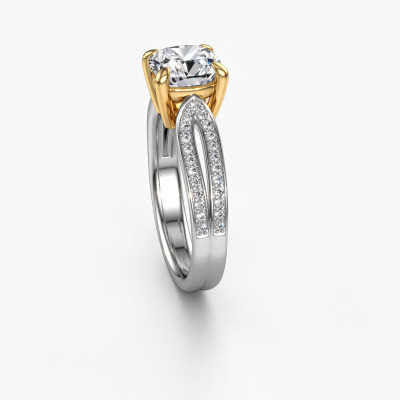 The ring shown above is called the Antonia cus 2. We call this type of ring a pavé solitaire ring because it has one center gemstone and a band that is also pave set with gemstones. The 14 Carat white gold engagement ring is set with a cushion 2.00 crt diamond center stone and the band is pave set with lab-grown diamond gemstones. Each jewel is made just for you by our master goldsmiths in our own studio.This fantasy white gold pavé solitaire engagement ring has an exquisite cushion diamond center stone. To further accentuate the center stone, the band is fully set with more lab grown diamonds. Its open prong setting allows light to strike the diamond from various angles and this adds sparkle to your diamond ring. The photo shown above depicts the goldsmith's carefully handcrafted details of the ring. The high positioning of the center stone is truly eye-catching. The perfect engagement ring for the crown jewel of your life! By using our modern techniques, we can design and customize the finest quality jewels with the utmost care for you. Our engagement rings are always priced 30 percent lower than other jewelers. We make engagement rings to order so we don't have to maintain a large stock. If you have a certain budget, we are more than happy to advice you accordingly.Have you found a specific engagement ring somewhere which you would like to give to your loved one? Please feel free to express your wishes to our jewel designers because we would be honored to turn your design into a fantasy engagement ring. You can follow the development of your ring design because we use 3D drawings. This gives you a realistic preview of how your design will look. You can also preorder a dummy. A dummy is a plastic ring, which can be shaped according your ring design. You can try it on and check if its width and size are suitable for you. We will gladly send you a non-binding offer, based on a fair price/ quality ratio. It will amaze you, considering the quality of the ring and gemstones.To make it easier for you, we offer a 30 day return policy. Check our terms and conditions.