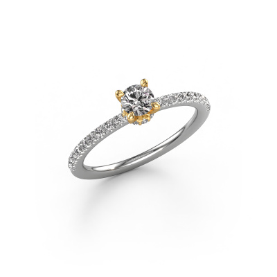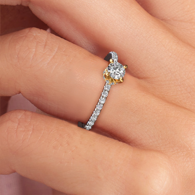 The ring shown above is called the Crystal rnd 4. We call this type of ring a pavé solitaire ring because it has one center gemstone and a band that is also pave set with gemstones. The 14 Carat white gold engagement ring is set with a round 0.25 crt diamond center stone and the band is pave set with lab-grown diamond gemstones. Each jewel is made to shine bright around your finger. Each jewel is hand made with love by our goldsmiths.This fantasy white gold pavé solitaire engagement ring has an exquisite round diamond center stone. To further accentuate the center stone, the band is fully set with more lab grown diamonds. Its open prong setting allows light to strike the diamond from various angles and this adds sparkle to your diamond ring. The photo shown above depicts the goldsmith's carefully handcrafted details of the ring. The high positioning of the center stone is truly eye-catching. The perfect engagement ring for the crown jewel of your life! By using our modern techniques, we can design and customize the finest quality jewels with the utmost care for you. Our engagement rings are always priced 30 percent lower than other jewelers. We make engagement rings to order so we don't have to maintain a large stock. If you have a certain budget, we are more than happy to advice you accordingly.Have you found a specific engagement ring somewhere which you would like to give to your loved one? Please feel free to express your wishes to our jewel designers because we would be honored to turn your design into a fantasy engagement ring. You can follow the development of your ring design because we use 3D drawings. This gives you a realistic preview of how your design will look. You can also preorder a dummy. A dummy is a plastic ring, which can be shaped according your ring design. You can try it on and check if its width and size are suitable for you. We will gladly send you a non-binding offer, based on a fair price/ quality ratio. It will amaze you, considering the quality of the ring and gemstones.To make it easier for you, we offer a 30 day return policy. Check our terms and conditions.