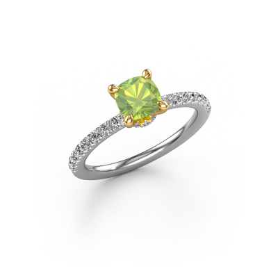 The ring shown above is called the Crystal CUS 4. We call this type of ring a pavé solitaire ring because it has one center gemstone and a band that is also pave set with gemstones. The 14 Carat white gold engagement ring is set with a cushion 5.5 mm peridot center stone and the band is pave set with diamond gemstones. Each jewel is created to add sparkle to your finger, each jewel is lovingly made by hand by our goldsmiths.This chic white gold pavé solitaire engagement ring has an exquisite cushion peridot center stone. To further accentuate the center stone, the band is fully set with more diamonds. Its open prong setting allows light to strike the peridot from various angles and this adds sparkle to your peridot ring. The photo shown above depicts the goldsmith's carefully handcrafted details of the ring. The high positioning of the center stone is truly eye-catching. The perfect engagement ring for the crown jewel of your life! By using our modern techniques, we can design and customize the finest quality jewels with the utmost care for you. Our engagement rings are always priced 30 percent lower than other jewelers. We make engagement rings to order so we don't have to maintain a large stock. If you have a certain budget, we are more than happy to advice you accordingly.Do you have a specific ring in mind? One you came across somewhere. Please feel free to tell us your wishes and we will turn your design into a unique engagement ring. You can follow the development of your ring design because we use 3D drawings. This gives you a realistic preview of your design. We will gladly send you a non-binding offer, based on a fair price/ quality ratio. It will amaze you.To make it easier for you, we offer a 30 day return policy. Check our terms and conditions.