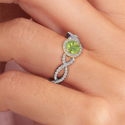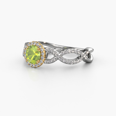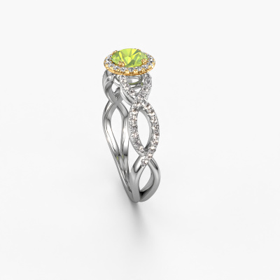 The ring shown above is called the Dionne rnd. We call this type of ring a pavé solitaire ring because it has one center gemstone and a band that is also pave set with gemstones. The 14 Carat white gold engagement ring is set with a round 5 mm peridot center stone and the band is pave set with diamond gemstones. Each jewel is made just for you by our master goldsmiths in our own studio.This classic white gold pavé solitaire engagement ring has an exquisite round peridot center stone. To further accentuate the center stone, the band is fully set with more diamonds. Its open prong setting allows light to strike the peridot from various angles and this adds sparkle to your peridot ring. The photo shown above depicts the goldsmith's carefully handcrafted details of the ring. The high positioning of the center stone is truly eye-catching. The perfect engagement ring for the crown jewel of your life! Because we design and deliver our own rings, we can offer you a engagement ring at a price you won't find anywhere else. A ring is made to order, which helps prevent excess supplies, so we can make you a great price offer. We understand it feels risky, buying your engagement ring online, but we will gladly assist in the designing process, taking your budget into consideration.Do you have a specific ring in mind? One you came across somewhere. Please feel free to tell us your wishes and we will turn your design into a unique engagement ring. You can follow the development of your ring design because we use 3D drawings. This gives you a realistic preview of your design. We will gladly send you a non-binding offer, based on a fair price/ quality ratio. It will amaze you.To make it easier for you, we offer a 30 day return policy. Check our terms and conditions.
