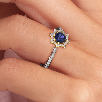 This 14 Carat white gold ring is called Zena and is set with sapphire. An extraordinary white gold vintage ring. One that will surely make the love of your life shine like a diamond! That is what we hope to achieve. This fantasy engagement ring is