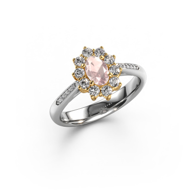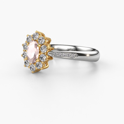 The ring shown above is called the Leesa 2. We call this type of ring a cluster ring, the center gemstone is surrounded by smaller sized stones. This 14 Carat white gold version is set with a 6x4 mm oval morganite champagne center stone, embraced by smaller diamonds. The classic white gold cluster engagement ring stands out because of its shape. Together, the smaller and bigger sized morganite champagne gemstones form a flower and they appear to collide into one big sparkling gem. This classic engagement ring is also known as the flower ring. Our expert Goldsmiths make sure the smaller diamonds stones are set identically so there is no light interference in the morganite champagne but unity instead. With perfect precision and a skillful hand each morganite champagne is set in the ring. During manufacturing, it is constantly monitored to make sure light reflects flawlessly. This results in a unique engagement ring, with a radiant morganite champagne at its centre. A lovely, meaningful gift to bestow upon the love of your life. Are you on a budget? Please feel free to contact us, so we can go discuss your options. We offer our engagement rings at guaranteed best price, because we make them to order. You won't find such a price anywhere else!Our designers and goldsmiths work together each day, creating new jewels. Perhaps you have found a nice classic engagement ring somewhere, which can be used to customize your unique ring. Please feel free to contact us. We will make you an offer, based on a fair price/ quality ratio, which will amaze you.To make it easier for you, we offer a 30 day return policy. Check our terms and conditions.