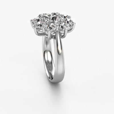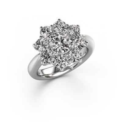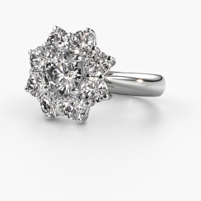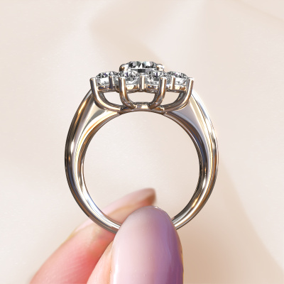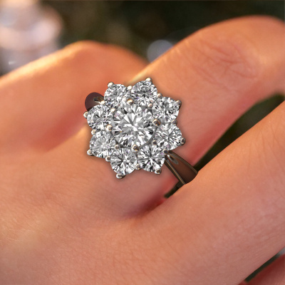 The ring shown above is called the Carolyn 1. We call this type of ring a cluster ring, the center gemstone is surrounded by smaller sized stones. This 14 Carat white gold version is set with a 1.00 crt round diamond center stone, embraced by smaller diamonds. The traditional white gold cluster engagement ring stands out because of its shape. Together, the smaller and bigger sized diamond gemstones form a flower and they appear to collide into one big sparkling gem. This traditional engagement ring is also known as the flower ring. Our expert Goldsmiths make sure the smaller diamonds stones are set identically so there is no light interference in the diamond but unity instead. With perfect precision and a skillful hand each diamond is set in the ring. During manufacturing, it is constantly monitored to make sure light reflects flawlessly. This results in a unique engagement ring, with a radiant diamond at its centre. A lovely, meaningful gift to bestow upon the love of your life. By using our modern techniques, we can design and customize the finest quality jewels with the utmost care for you. Our engagement rings are always priced 30 percent lower than other jewelers. We make engagement rings to order so we don't have to maintain a large stock. If you have a certain budget, we are more than happy to advice you accordingly.Do you have a specific ring in mind? One you came across somewhere. Please feel free to tell us your wishes and we will turn your design into a unique engagement ring. You can follow the development of your ring design because we use 3D drawings. This gives you a realistic preview of your design. We will gladly send you a non-binding offer, based on a fair price/ quality ratio. It will amaze you.To make it easier for you, we offer a 30 day return policy. Check our terms and conditions.