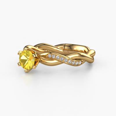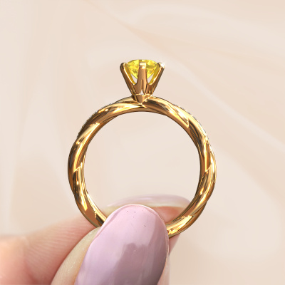 In your eyes, no one else compares to her. She is one in a million, unlike anyone else and pure? These qualities are emphasized perfectly by our fantasy gold solitaire yellow sapphire ring. This yellow sapphire is carefully selected by our keen artisan goldsmiths. It equals the unique qualities of the love of your life. There is no better way to memorialize your proposal than this symbol of true love. The ring shown above is called the Page, we call this a solitaire ring because it contains a single gemstone. The engagement ring is made in 14 Carat gold and has a round yellow sapphire of 5.4 mm. Each piece of jewelry is made with passion and love by one of our master goldsmiths.Are you on a budget? Please feel free to contact us, so we can go discuss your options. We offer our engagement rings at guaranteed best price, because we make them to order. You won't find such a price anywhere else!Do you have a specific ring in mind? One you came across somewhere. Please feel free to tell us your wishes and we will turn your design into a unique engagement ring. You can follow the development of your ring design because we use 3D drawings. This gives you a realistic preview of your design. We will gladly send you a non-binding offer, based on a fair price/ quality ratio. It will amaze you.To make it easier for you, we offer a 30 day return policy. Check our terms and conditions.