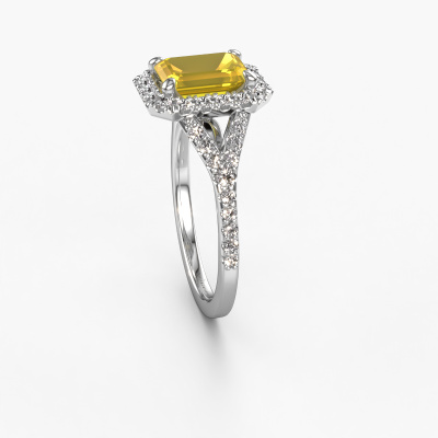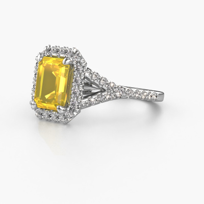 The ring shown above is called the Kimber EME. We call this type of ring a pavé solitaire ring because it has one center gemstone and a band that is also pave set with gemstones. The platinum engagement ring is set with a emerald cut 8x6 mm yellow sapphire center stone and the band is pave set with lab-grown diamond gemstones. Each jewel is made by a team of passionate goldsmiths and jewel designers. This will make your crown jewel truly eye-catching.This exclusive platinum pavé solitaire engagement ring has an exquisite emerald cut yellow sapphire center stone. To further accentuate the center stone, the band is fully set with more lab grown diamonds. Its open prong setting allows light to strike the yellow sapphire from various angles and this adds sparkle to your yellow sapphire ring. The photo shown above depicts the goldsmith's carefully handcrafted details of the ring. The high positioning of the center stone is truly eye-catching. The perfect engagement ring for the crown jewel of your life! By using a combination of the latest modern techniques, combined with ancient crafting, we can make all our engagement rings in our own studio. Each jewel is made to order. This is advantageous because we can offer you a price you won't find anywhere else.Our team adds new designs to our online collection daily. Our designers and goldsmiths work together in creating the best design. We strive to offer a diverse collection of jewels. Perhaps you have a specific jewel design in mind. One you came across somewhere. Please contact us for a free consultation. We will make you an offer, based on a fair price/ quality ratio, that will baffle you.To make it easier for you, we offer a 30 day return policy. Check our terms and conditions.
