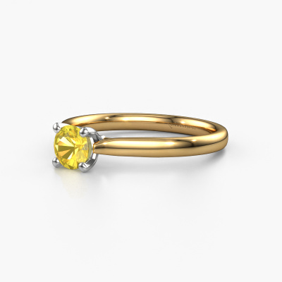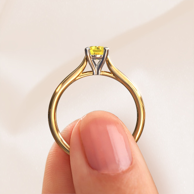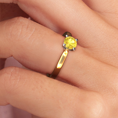 The ring shown above is called the Mignon rnd 1, we call this a solitaire ring because it contains a single gemstone. The engagement ring is made in 14 Carat gold and has a round yellow sapphire of 5 mm. The cool thing about our configurator is that you can compile your own piece of jewelry, into a completely personalized one. This solitaire ring is crafted in the precious metals gold with white gold, but of course you are free to pick your own colors. Each piece of jewelry is made with passion and love by one of our master goldsmiths.The solitaire ring is a special type of engagement ring. Its open prong setting allows light to strike the gemstone from various angles. This classic engagement ring is a stunning eye-catcher because of the high positioning of the gemstone. In order for you to commemorate your proposal with a unique ring, we carefully adorn this solitaire ring by hand. The love of your life deserves nothing but the best. After receiving your order, our goldsmiths will passionately start the creative process of making your engagement ring in our own studio. Because we don't have a big stockpile, these costs will not be passed on to you. Our pricing is proof of that! We offer top quality jewels at lowest price, guaranteed.Have you found a specific engagement ring somewhere which you would like to give to your loved one? Please feel free to express your wishes to our jewel designers because we would be honored to turn your design into a classic engagement ring. You can follow the development of your ring design because we use 3D drawings. This gives you a realistic preview of how your design will look. You can also preorder a dummy. A dummy is a plastic ring, which can be shaped according your ring design. You can try it on and check if its width and size are suitable for you. We will gladly send you a non-binding offer, based on a fair price/ quality ratio. It will amaze you, considering the quality of the ring and gemstones.To make it easier for you, we offer a 30 day return policy. Check our terms and conditions.