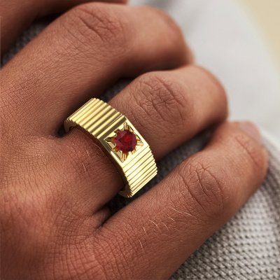 For the contemporary, stylish man that likes a bit of extravagance, we offer the heavy 14 Carat gold Elias pinky ring with ruby. Traditionally a pinky ring was worn as a sign of wealth. That is why a pink ring is perfectly suited for men who want to stand out. How do you like this modern gold men's ring? Simply customize this Elias men's ring, using our online tool. Subsequently, your personal best prices Elias men's ring will be made by hand by our goldsmiths. Precious metals and gemstones can be customized to your liking. Do you have specific preferences which are unavailable in our online tool? Please feel free to contact us. We will customize your personal modern men's ring to your liking.