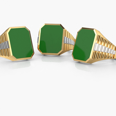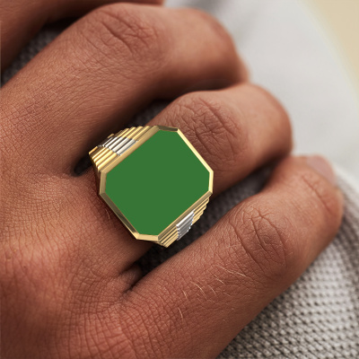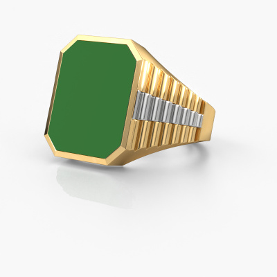 Everyone knows the design of this well-known watch brand. With two colors of gold links, this 2 Colors 14 Carat gold Brent 4 signet ring, is perfectly suited for trendy, successful men. A man who wants to dress to impress with a striking signet ring with 16x13 mm green enamel. Show them what you are made of!Customize your own luxury Brent 4 signet ring, which will then be created by our goldsmiths with great passion. Do you prefer a different option than is shown here in the gold Brent 4 signet ring? Then our online tools offers various options. Feel free to ask us for help if you are unable to succeed. We are happy to answer your questions!Our team of talented, passionate designers add new ring designs to our online collection daily. Our objective in doing so, is to be able to offer you a wide variety of jewels. Please feel free to request a quote if you have specific wishes for your ring. We guarantee to make you an offer you can't refuse.Are you on a budget? Please feel free to contact us, so we can go discuss your options. We offer our rings at guaranteed best price, because we make them to order. You won't find such a price anywhere else!To make it easier for you, we offer a 30 day return policy. Check our terms and conditions.