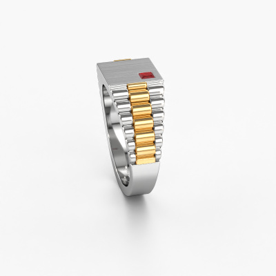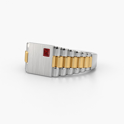 Everyone knows the design of this well-known watch brand. With two colors of white gold links, this solid 14 Carat white gold Pelle men's ring, is perfectly suited for trendy, successful men. A man who wants to dress to impress with a striking men's ring with 3 mm ruby. Show them what you are made of!The best part of this royal men's ring is that you can customize it to your own liking. Your style, your choice, your men's ring. On top of that, your luxury white gold men's ring will be made by hand with eco-friendly materials! Please feel free to easily customize the ring, using our online tool. Of course, you can always contact us. We will gladly help you compiling your luxury men's ring. Is there a design you like, but you would like to customize it with a gemstone we do not offer on our website, then please contact us. We're happy to tell you about the possibilities.Our team of talented, passionate designers add new ring designs to our online collection daily. Our objective in doing so, is to be able to offer you a wide variety of jewels. Please feel free to request a quote if you have specific wishes for your ring. We guarantee to make you an offer you can't refuse.After receiving your order, our goldsmiths will start the creative process of making your Pelle ring. We don't keep stock. This is advantageous because these costs will not be passed on to you. Therefore, we can offer jewelry at exceptionally low prices.To make it easier for you, we offer a 30 day return policy. Check our terms and conditions.