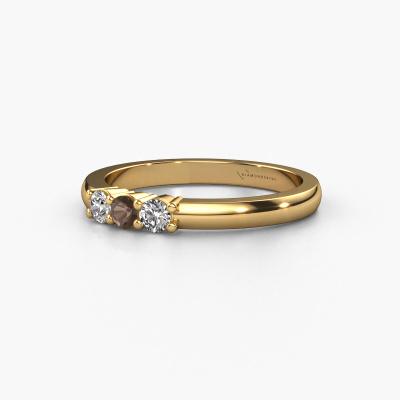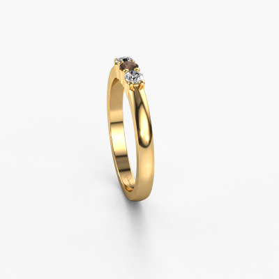 This extraordinary ring is called Yasmin 3. This type of ring is known as a memoire ring, because its gemstones are set in a continuous line. This makes it easy to combine with other rings. The band of this 14 Carat gold ring is set in a combination of smokey quartz and lab-grown diamond 3 mm. You can easily choose the combination you prefer online. As you can see, a single smokey quartz is set in this single alliance gold ring. The memoire ring represents collaboration. And that is precisely what these gemstones do, collaborate. Together they add a beautiful effect to the band of a classic ring! Such a meaningful ring, wouldn't you agree? All of our hand selected smokey quartz are positioned by hand by our expert goldsmith. It's a precise task, which can only be completed successfully through the combination of pure craftsmanship and usage of the latest techniques which give it an optimal effect. To create a perfect reflection of light, all the gemstones have to be perfectly aligned in the same way. During manufacturing, the expert goldsmith will therefore monitor the reflection of light constantly to check whether the smokey quartz are aligned properly. This requires a skilled hand and a lot of patience but then the end product will be a true piece of art. And that is our mission!By using a combination of the latest modern techniques, combined with ancient crafting, we can make all our rings in our own studio. Each jewel is made to order. This is advantageous because we can offer you a price you won't find anywhere else.Our talented designers add new designs to our online collection daily. Together they create a diverse collection of the finest jewelry. If you prefer to make a ring according your own design, please feel free to request a quote. We will make you an amazing offer, based on quality and price.To make it easier for you, we offer a 30 day return policy. Check our terms and conditions.