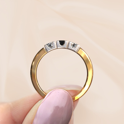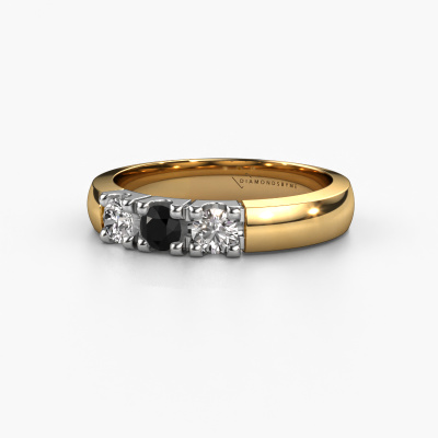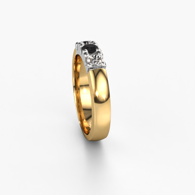 This extraordinary ring is called Rianne 3. This type of ring is known as a memoire ring, because its gemstones are set in a continuous line. This makes it easy to combine with other rings. The band of this 14 Carat gold ring is set in a combination of black diamond and diamond 0.48 crt. You can easily choose the combination you prefer online. As you can see, a single black diamond is set in this single alliance gold ring. The memoire ring represents collaboration. And that is precisely what these gemstones do, collaborate. Together they add a beautiful effect to the band of a classic ring! Such a meaningful ring, wouldn't you agree? All of our hand selected black diamonds are positioned by hand by our expert goldsmith. It's a precise task, which can only be completed successfully through the combination of pure craftsmanship and usage of the latest techniques which give it an optimal effect. To create a perfect reflection of light, all the gemstones have to be perfectly aligned in the same way. During manufacturing, the expert goldsmith will therefore monitor the reflection of light constantly to check whether the black diamonds are aligned properly. This requires a skilled hand and a lot of patience but then the end product will be a true piece of art. And that is our mission!After receiving your order, our goldsmiths will passionately start the creative process of making your ring in our own studio. Because we don't have a big stockpile, these costs will not be passed on to you. Our pricing is proof of that! We offer top quality jewels at lowest price, guaranteed.Our team of talented, passionate designers add new ring designs to our online collection daily. Our objective in doing so, is to be able to offer you a wide variety of jewels. Please feel free to request a quote if you have specific wishes for your ring. We guarantee to make you an offer you can't refuse.To make it easier for you, we offer a 30 day return policy. Check our terms and conditions.