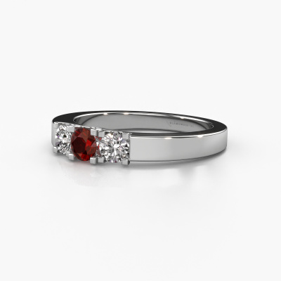 This extraordinary ring is called Selina 1. This type of ring is known as a memoire ring, because its gemstones are set in a continuous line. This makes it easy to combine with other rings. The band of this platinum ring is set in a combination of garnet and diamond 3.7 mm. You can easily choose the combination you prefer online. As you can see, a single garnet is set in this single alliance platinum ring. The memoire ring represents collaboration. And that is precisely what these gemstones do, collaborate. Together they add a beautiful effect to the band of a modern ring! Such a meaningful ring, wouldn't you agree? All of our hand selected garnet are positioned by hand by our expert goldsmith. It's a precise task, which can only be completed successfully through the combination of pure craftsmanship and usage of the latest techniques which give it an optimal effect. To create a perfect reflection of light, all the gemstones have to be perfectly aligned in the same way. During manufacturing, the expert goldsmith will therefore monitor the reflection of light constantly to check whether the garnet are aligned properly. This requires a skilled hand and a lot of patience but then the end product will be a true piece of art. And that is our mission!By using our modern techniques, we can design and customize the finest quality jewels with the utmost care for you. Our rings are always priced 30 percent lower than other jewelers. We make rings to order, so we don't have to maintain a large stock. If you have a certain budget, we are more than happy to advice you accordingly.New jewelry designs are added to our online collection daily. Our team of passionate designers strive to create extraordinary and diverse designs. Have you seen a ring you like? Please feel free to contact us. Based on a good price/ quality ratio, we will make you an offer you can't refuse!To make it easier for you, we offer a 30 day return policy. Check our terms and conditions.
