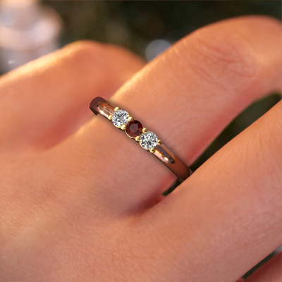 This extraordinary ring is called Yasmin 3. This type of ring is known as a memoire ring, because its gemstones are set in a continuous line. This makes it easy to combine with other rings. The band of this 14 Carat rose gold ring is set in a combination of garnet and lab-grown diamond 3 mm. You can easily choose the combination you prefer online. As you can see, a single garnet is set in this single alliance rose gold ring. The memoire ring represents collaboration. And that is precisely what these gemstones do, collaborate. Together they add a beautiful effect to the band of a classic ring! Such a meaningful ring, wouldn't you agree? All of our hand selected garnet are positioned by hand by our expert goldsmith. It's a precise task, which can only be completed successfully through the combination of pure craftsmanship and usage of the latest techniques which give it an optimal effect. To create a perfect reflection of light, all the gemstones have to be perfectly aligned in the same way. During manufacturing, the expert goldsmith will therefore monitor the reflection of light constantly to check whether the garnet are aligned properly. This requires a skilled hand and a lot of patience but then the end product will be a true piece of art. And that is our mission!By using a combination of the latest modern techniques, combined with ancient crafting, we can make all our rings in our own studio. Each jewel is made to order. This is advantageous because we can offer you a price you won't find anywhere else.Our talented designers add new designs to our online collection daily. Together they create a diverse collection of the finest jewelry. If you prefer to make a ring according your own design, please feel free to request a quote. We will make you an amazing offer, based on quality and price.To make it easier for you, we offer a 30 day return policy. Check our terms and conditions.