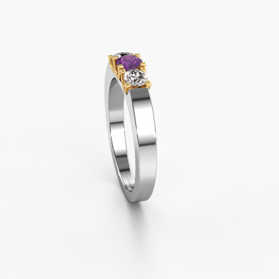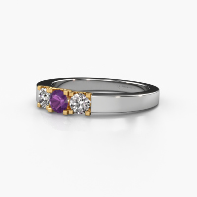 This extraordinary ring is called Selina 1. This type of ring is known as a memoire ring, because its gemstones are set in a continuous line. This makes it easy to combine with other rings. The band of this 14 Carat white gold ring is set in a combination of amethyst and diamond 3.7 mm. You can easily choose the combination you prefer online. As you can see, a single amethyst is set in this single alliance white gold ring. The memoire ring represents collaboration. And that is precisely what these gemstones do, collaborate. Together they add a beautiful effect to the band of a modern ring! Such a meaningful ring, wouldn't you agree? All of our hand selected amethysten are positioned by hand by our expert goldsmith. It's a precise task, which can only be completed successfully through the combination of pure craftsmanship and usage of the latest techniques which give it an optimal effect. To create a perfect reflection of light, all the gemstones have to be perfectly aligned in the same way. During manufacturing, the expert goldsmith will therefore monitor the reflection of light constantly to check whether the amethysten are aligned properly. This requires a skilled hand and a lot of patience but then the end product will be a true piece of art. And that is our mission!By using our modern techniques, we can design and customize the finest quality jewels with the utmost care for you. Our rings are always priced 30 percent lower than other jewelers. We make rings to order, so we don't have to maintain a large stock. If you have a certain budget, we are more than happy to advice you accordingly.New jewelry designs are added to our online collection daily. Our team of passionate designers strive to create extraordinary and diverse designs. Have you seen a ring you like? Please feel free to contact us. Based on a good price/ quality ratio, we will make you an offer you can't refuse!To make it easier for you, we offer a 30 day return policy. Check our terms and conditions.