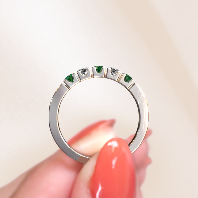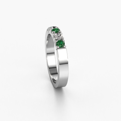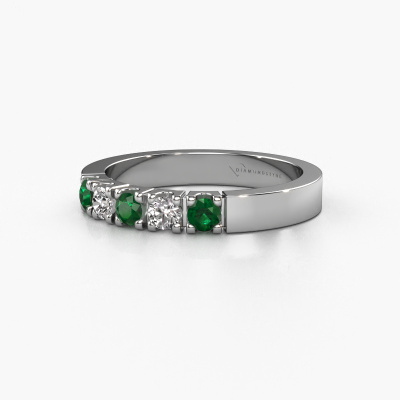 This extraordinary ring is called Dana 5. This type of ring is known as a memoire ring, because its gemstones are set in a continuous line. This makes it easy to combine with other rings. The band of this platinum ring is set in a combination of emerald and diamond 3 mm. You can easily choose the combination you prefer online. As you can see, a single emerald is set in this single alliance platinum ring. The memoire ring represents collaboration. And that is precisely what these gemstones do, collaborate. Together they add a beautiful effect to the band of a modern ring! Such a meaningful ring, wouldn't you agree? All of our hand selected emeralds are positioned by hand by our expert goldsmith. It's a precise task, which can only be completed successfully through the combination of pure craftsmanship and usage of the latest techniques which give it an optimal effect. To create a perfect reflection of light, all the gemstones have to be perfectly aligned in the same way. During manufacturing, the expert goldsmith will therefore monitor the reflection of light constantly to check whether the emeralds are aligned properly. This requires a skilled hand and a lot of patience but then the end product will be a true piece of art. And that is our mission!Because we design and deliver our own rings, we can offer you a ring at a price you won't find anywhere else. A ring is made to order, which helps prevent excess supplies, so we can make you a great price offer. We understand it feels risky, buying your ring online, but we will gladly assist in the designing process, taking your budget into consideration.New jewelry designs are added to our online collection daily. Our team of passionate designers strive to create extraordinary and diverse designs. Have you seen a ring you like? Please feel free to contact us. Based on a good price/ quality ratio, we will make you an offer you can't refuse!To make it easier for you, we offer a 30 day return policy. Check our terms and conditions.