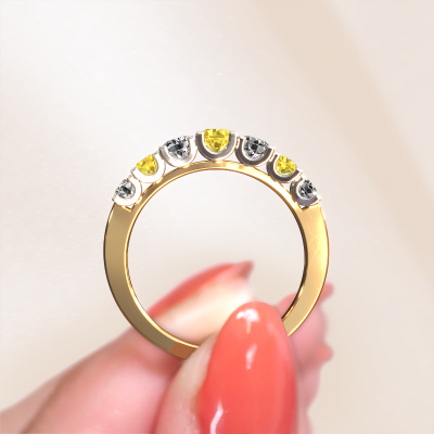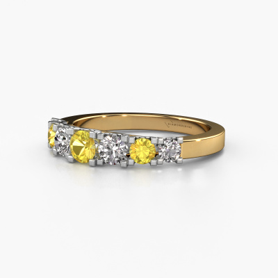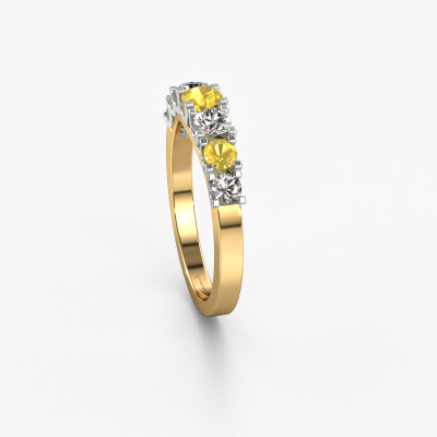This extraordinary ring is called Selina 3. This type of ring is known as a memoire ring, because its gemstones are set in a continuous line. This makes it easy to combine with other rings. The band of this 14 Carat gold ring is set in a combination of yellow sapphire and diamond 3.7 mm. You can easily choose the combination you prefer online. As you can see, a single yellow sapphire is set in this single alliance gold ring. The memoire ring represents collaboration. And that is precisely what these gemstones do, collaborate. Together they add a beautiful effect to the band of a modern ring! Such a meaningful ring, wouldn't you agree? All of our hand selected yellow sapphire are positioned by hand by our expert goldsmith. It's a precise task, which can only be completed successfully through the combination of pure craftsmanship and usage of the latest techniques which give it an optimal effect. To create a perfect reflection of light, all the gemstones have to be perfectly aligned in the same way. During manufacturing, the expert goldsmith will therefore monitor the reflection of light constantly to check whether the yellow sapphire are aligned properly. This requires a skilled hand and a lot of patience but then the end product will be a true piece of art. And that is our mission!Because we design and deliver our own rings, we can offer you a ring at a price you won't find anywhere else. A ring is made to order, which helps prevent excess supplies, so we can make you a great price offer. We understand it feels risky, buying your ring online, but we will gladly assist in the designing process, taking your budget into consideration.Our team of talented, passionate designers add new ring designs to our online collection daily. Our objective in doing so, is to be able to offer you a wide variety of jewels. Please feel free to request a quote if you have specific wishes for your ring. We guarantee to make you an offer you can't refuse.To make it easier for you, we offer a 30 day return policy. Check our terms and conditions.