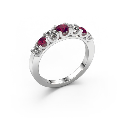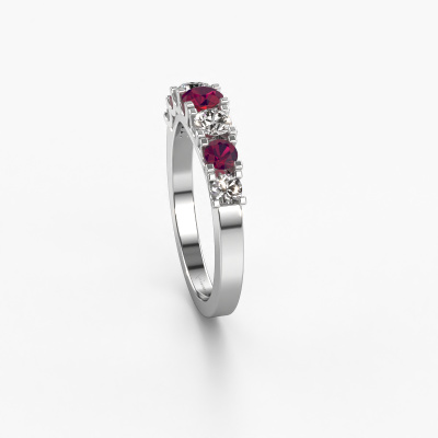 This extraordinary ring is called Selina 3. This type of ring is known as a memoire ring, because its gemstones are set in a continuous line. This makes it easy to combine with other rings. The band of this platinum ring is set in a combination of rhodolite and diamond 3.7 mm. You can easily choose the combination you prefer online. As you can see, a single rhodolite is set in this single alliance platinum ring. The memoire ring represents collaboration. And that is precisely what these gemstones do, collaborate. Together they add a beautiful effect to the band of a modern ring! Such a meaningful ring, wouldn't you agree? All of our hand selected rhodolite are positioned by hand by our expert goldsmith. It's a precise task, which can only be completed successfully through the combination of pure craftsmanship and usage of the latest techniques which give it an optimal effect. To create a perfect reflection of light, all the gemstones have to be perfectly aligned in the same way. During manufacturing, the expert goldsmith will therefore monitor the reflection of light constantly to check whether the rhodolite are aligned properly. This requires a skilled hand and a lot of patience but then the end product will be a true piece of art. And that is our mission!Because we design and deliver our own rings, we can offer you a ring at a price you won't find anywhere else. A ring is made to order, which helps prevent excess supplies, so we can make you a great price offer. We understand it feels risky, buying your ring online, but we will gladly assist in the designing process, taking your budget into consideration.Our team of talented, passionate designers add new ring designs to our online collection daily. Our objective in doing so, is to be able to offer you a wide variety of jewels. Please feel free to request a quote if you have specific wishes for your ring. We guarantee to make you an offer you can't refuse.To make it easier for you, we offer a 30 day return policy. Check our terms and conditions.